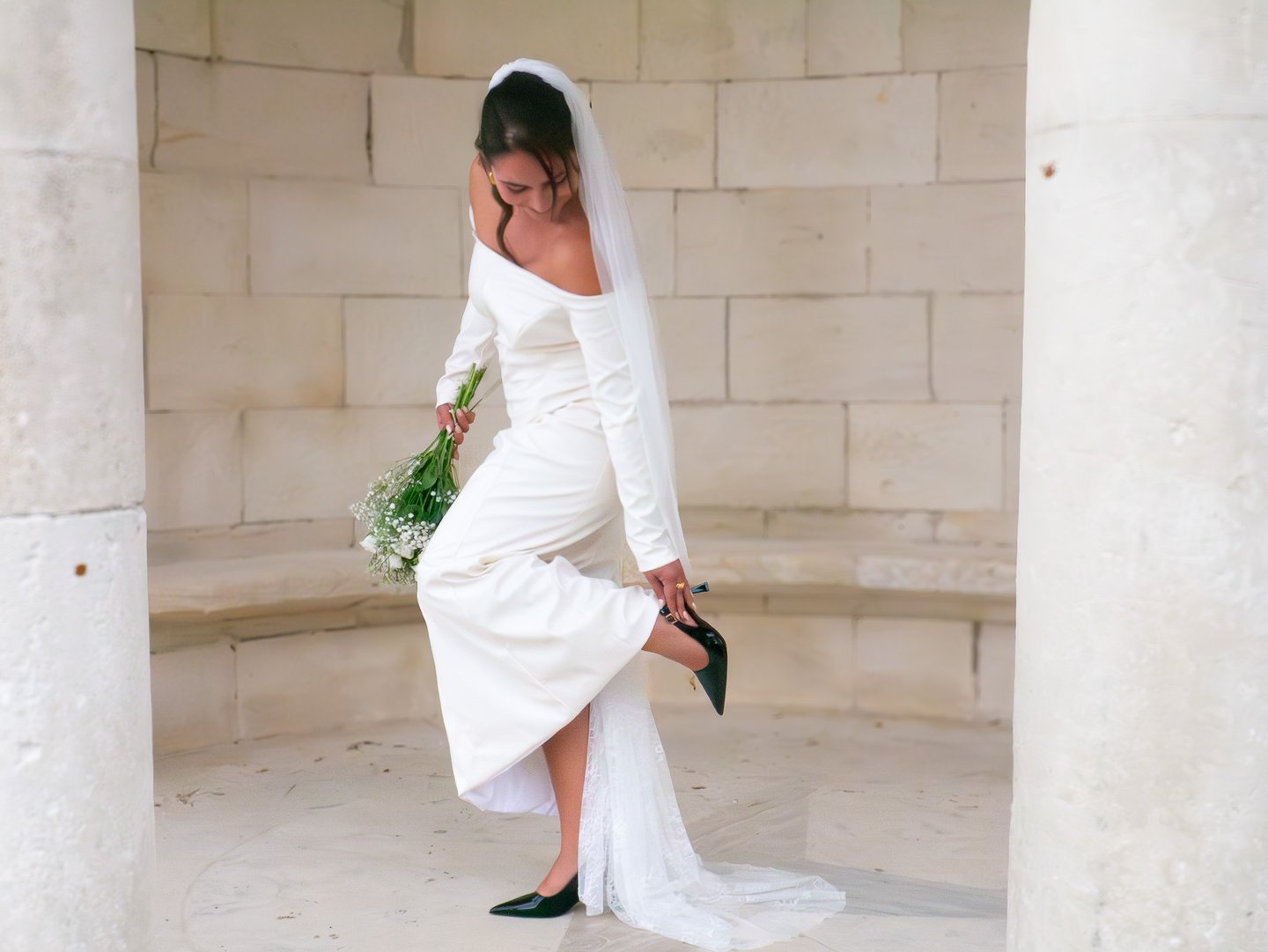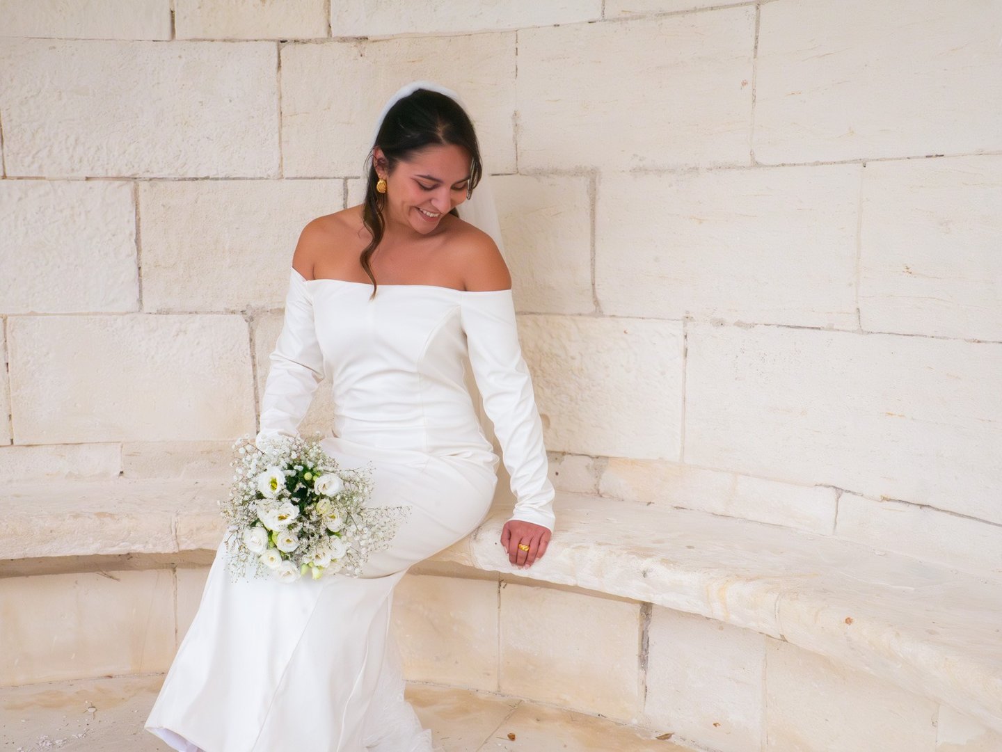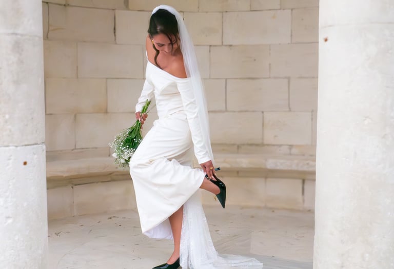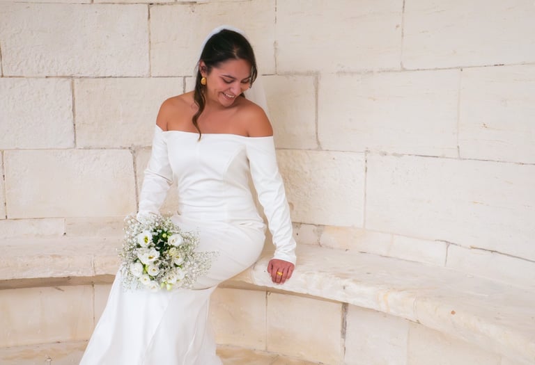 Au dos, une fente subtile s’ouvre pour dévoiler une traîne en dentelle amovible, détail raffiné qui mêle modernité et romantisme. Nathalie incarne une mariée à la beauté sereine, entre force et délicatesse, sobriété et grâce.